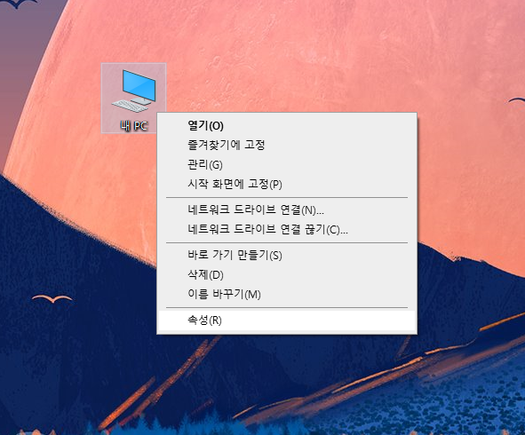 바탕화면에 내 PC - 속성 을 클릭